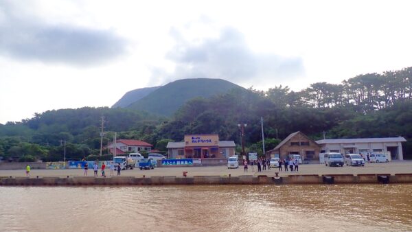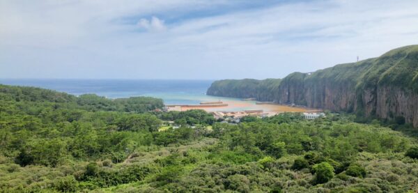 長浜港を斜面の中腹から見下ろすと、ここがかつて大噴火を起こした鬼界カルデラの巨大な噴火口の縁に位置していることが見て取れます。