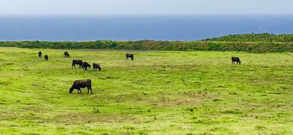 周囲には、島の基幹産業であるウシの放牧地が広がります。