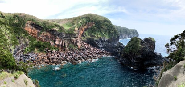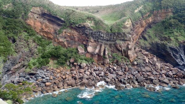 島の西側の大浦港には、カルデラ噴火の火砕流が幾重にも重なった地層と、それらが自身の熱と重みでV字型に圧縮変形する「溶結」と呼ばれる現象の切面が露出していました。