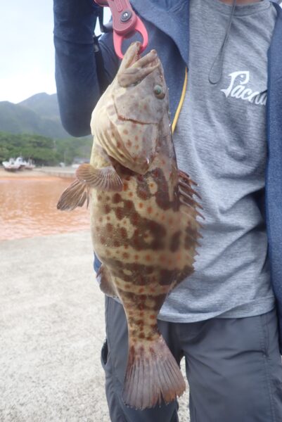 港では、船溜りの浅瀬でSacanaがハタ類の自己記録を更新する大きなチャイロマルハタを釣り上げていました。