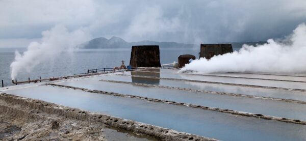 ここは火山の地熱を使った製塩所で、今でも煙を吹く製塩設備が残されています。