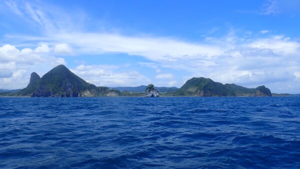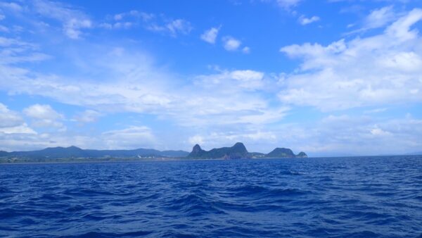 ソテツの自生地のある丘を海から見た所。ヨットで観測すると沿岸生態系の中規模なスケールが把握できます。