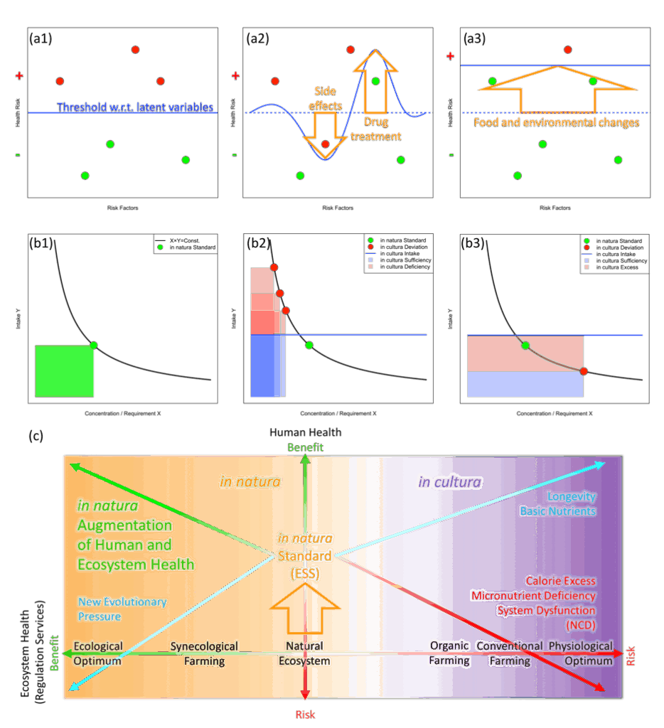 ESSでの摂取バランスをin naturaでの生態学的最適化とすると、in culturaによるシフトは食の変数の過剰/不足になり、健康リスクや環境負荷の増大をもたらします。人間と環境の両者の健康にとっての必要十分条件は、食の一次生産にin naturaを再導入すること、すなわち拡張された生態系の多様性の中で我々の代謝をESSの状態に維持することであると言えるでしょう9。一次生産へのそうしたアプローチは生物多様性への正味のプラスの影響(net positive impact)アプローチ20と整合性がありますし、これが世界の小規模農家に導入できれば、食-環境-健康のトリレンマを解決するボトムアップの解決策になる可能性が有ります60-61。
