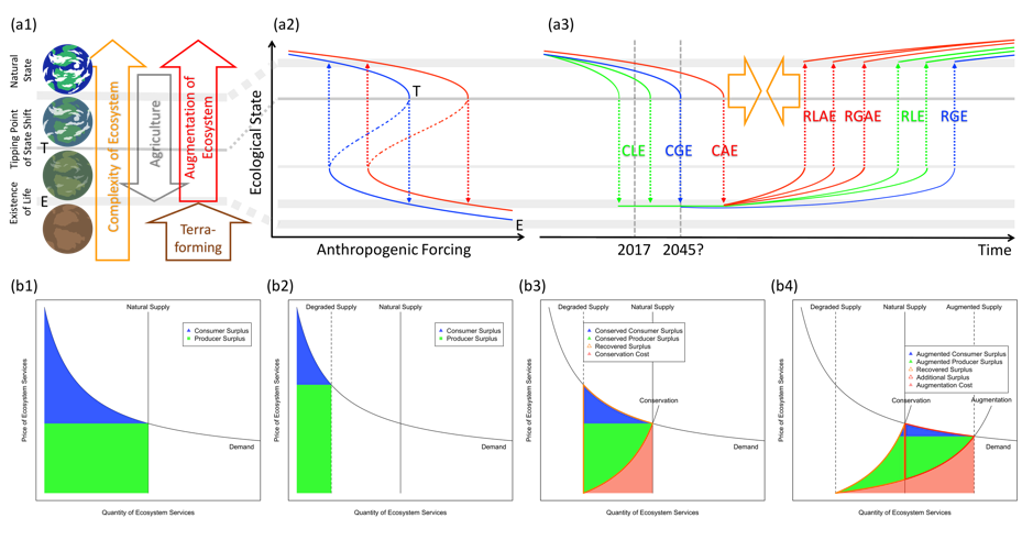 (a3)は、推測される生態系のステートシフトの防止あるいは逆転のダイナミクスを表しています。x軸は時間を表していて、2045年までに起こると予想されるグローバルステートシフト(地球生態系の全球的崩壊)の時点も示されています。y軸は(a2)と同様です。隙間のない(破線でない)線は(a2)の状態遷移を時間スケールで表しています。yの値は局所生態系の生物多様性(緑)、全球規模の生物多様性(青)、局所と全体すべてが拡張された生物多様性(赤)を表しています。破線の矢印は状態遷移を表しています。それぞれ、局所生態系の崩壊(CLE:緑の下方向への矢印)、全球生態系の崩壊(CGE:青の下方向への矢印)、拡張された生態系の局所的あるいは全球的な崩壊(CAE:赤の下方向への矢印)、局所生態系の回復(RLE:緑の上方向への矢印)、全球生態系の回復(RGE:青の上方向への矢印)、拡張された局所生態系の回復(RLAE:赤の上方向への矢印2つ)、拡張された全球生態系の回復(RGAE:赤の上方向への矢印)、です。