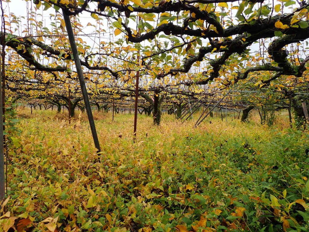 上の写真がそこに隣接する慣行の梨園の写真、下が田沢さんの梨園の写真です。肥料を与えないこと、草を刈らないことが、下に生えている雑草の様子をこれだけ違うものにしています。慣行の状態から無肥料栽培に転換していく中で起きた出来事、それについての考えなどを聞かせていただきました。今後、協生農法的視点で果樹の下に有用なハーブや野菜を導入していくことについて議論させていただきました。