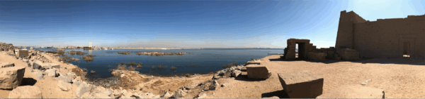 ナセル湖の中の小島にあるPhilae神殿から、アスワンハイダムとソ連の建設記念碑を望む。