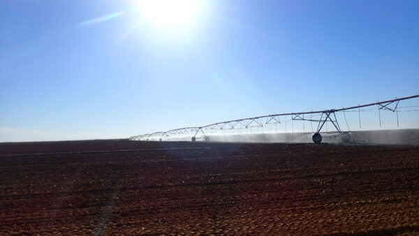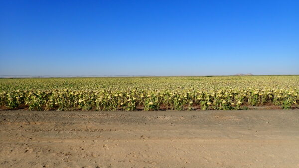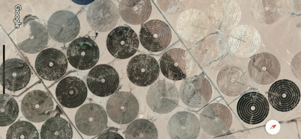 一面の砂漠の中で、Pivotと呼ばれる円形の自動散水器がゆっくりと旋回し、ヒマワリ、アルファルファ、コーン、サフランなどを作っていました。