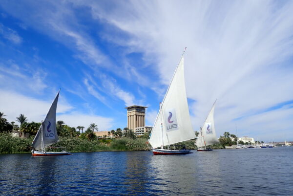 Aswan中心部では、ファルーカと呼ばれるヌビア人の船で移動します。動力が一切ない風のみの操船です。