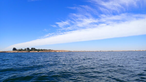 ナセル湖は広大な砂漠の中にアスワンハイダムによって造られた、全長550kmに及ぶ巨大な人造湖です。水蒸気の対流が突然起きているせいか、湖の縁にはライン状の雲が形成されていました。