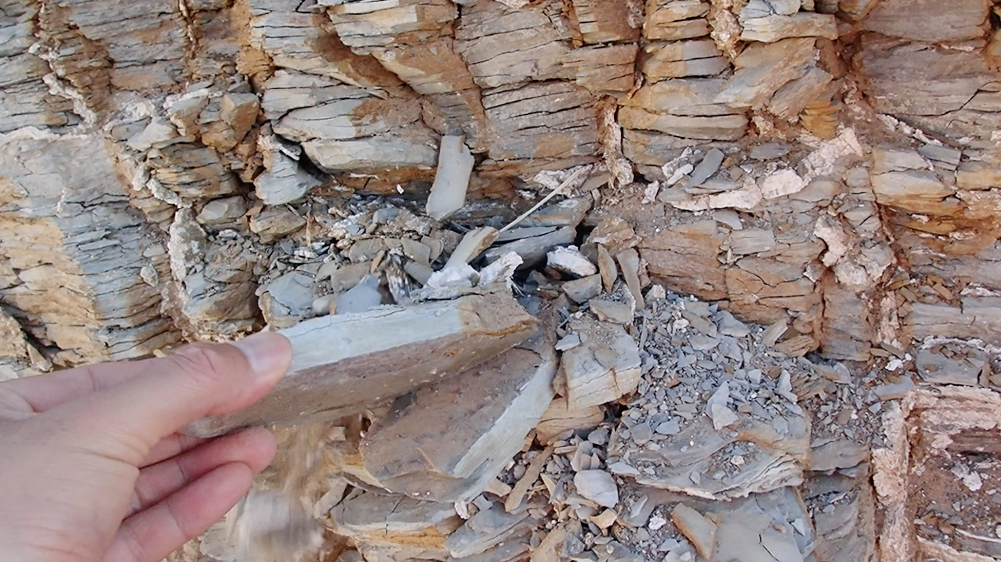 フィールドを少し掘ると、縦には割れにくく横に割れやすい黒鉛のような砂岩で埋め尽くされています。