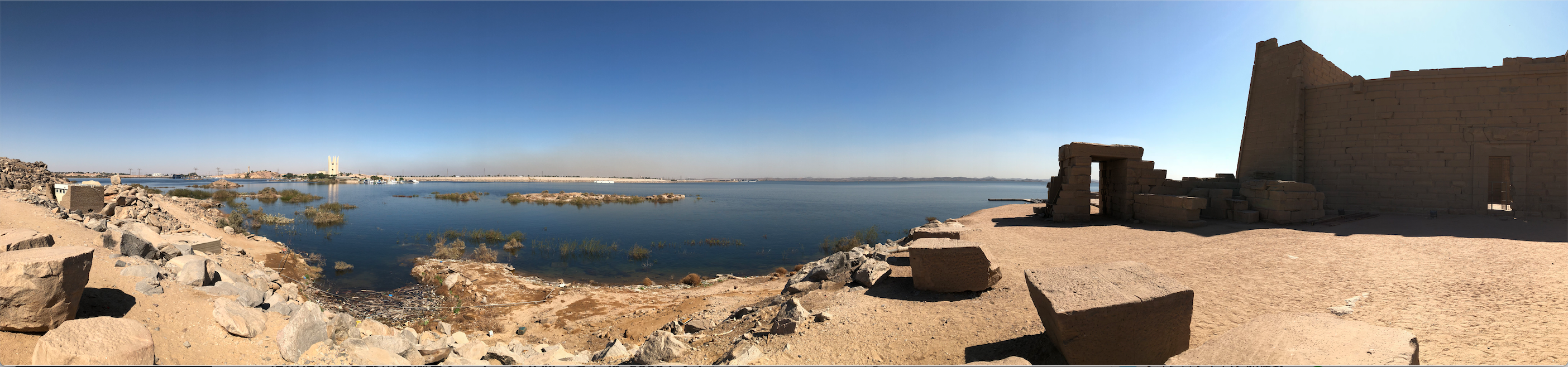 ナセル湖の中の小島にあるPhilae神殿から、アスワンハイダムとソ連の建設記念碑を望む。