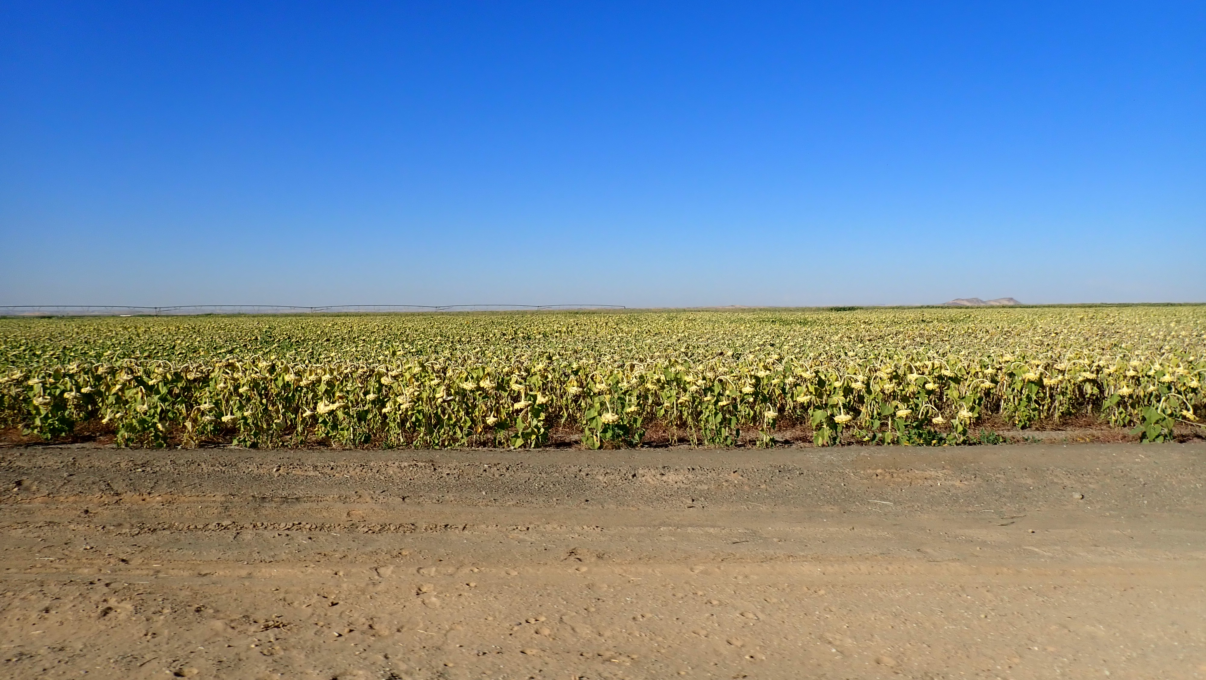 一面の砂漠の中で、Pivotと呼ばれる円形の自動散水器がゆっくりと旋回し、ヒマワリ、アルファルファ、コーン、サフランなどを作っていました。