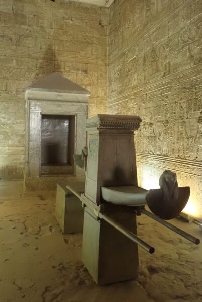 その前には、ご神体が空を天井のナイル川に見立てて旅をする為に、船神輿が据えられています(他の神殿の船神輿はほとんどが持ち去られています)。