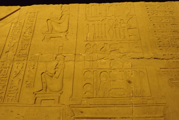 後に他の神殿でも出てきますが、入り口のスフィンクスは狛犬、神殿の門番であるハトホルの正面表示やイシス・ハトホルの横向き表示(profile)の彫像やレリーフは阿吽像と対応しているように感じます。