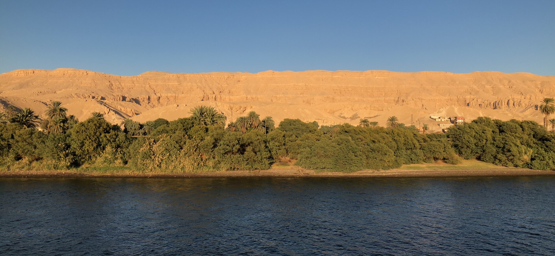 ナイル川沿いの細い緑地帯以外は、砂と岩の砂漠。北アフリカが湿潤だった時代が8−6000年前に終焉して以来、ファラオ時代を含めてずっと続いて来たであろう河岸の景色を眺めながら、船はゆっくりと下っていきます。