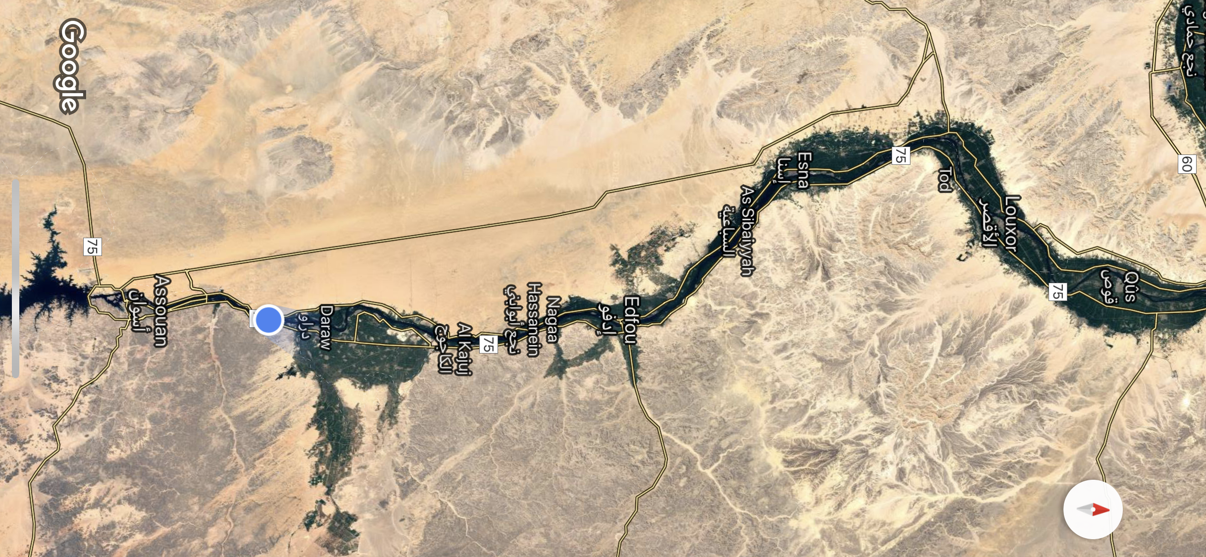 GoogleMapの衛星写真で見ると、ナイル川の周囲にだけ緑のラインが形成されているのがよくわかります。