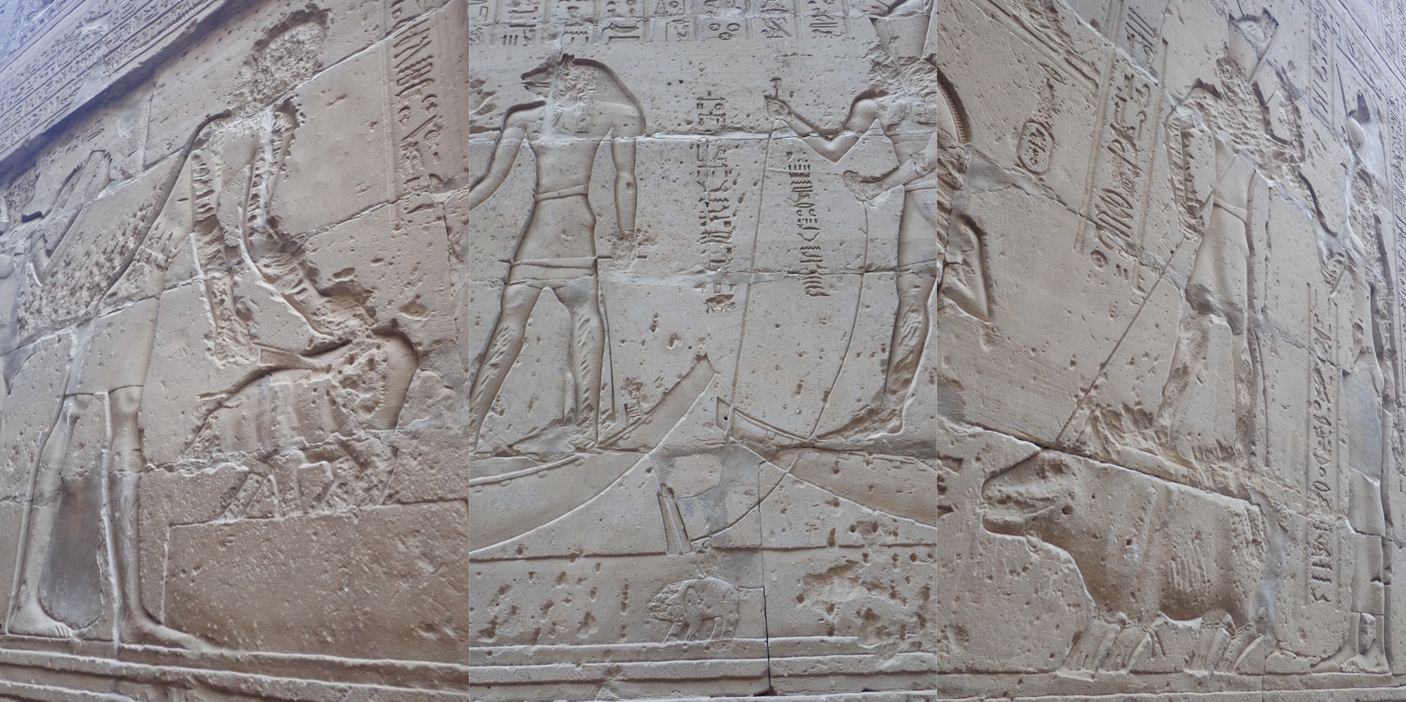 後に他の神殿でも出てきますが、入り口のスフィンクスは狛犬、神殿の門番であるハトホルの正面表示やイシス・ハトホルの横向き表示(profile)の彫像やレリーフは阿吽像と対応しているように感じます。