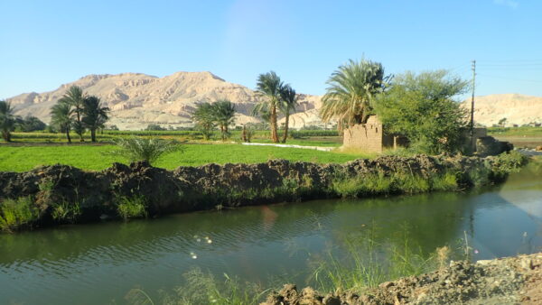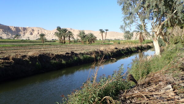 Luxorの西岸へ、市街を抜けて水路に沿って進むと、様々な畑がモザイク状に入り組んだ農地が広がっています。