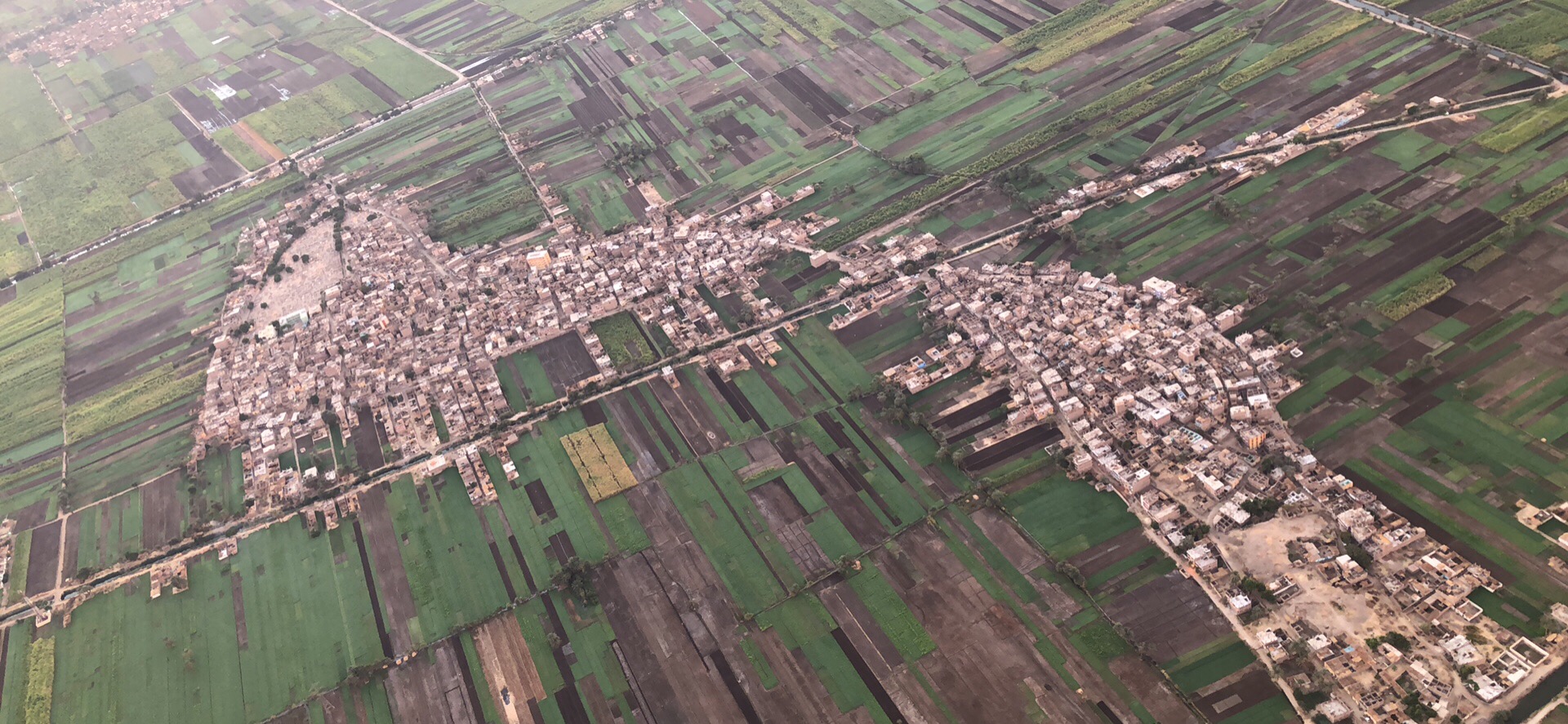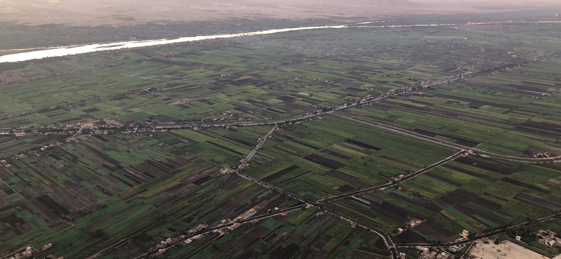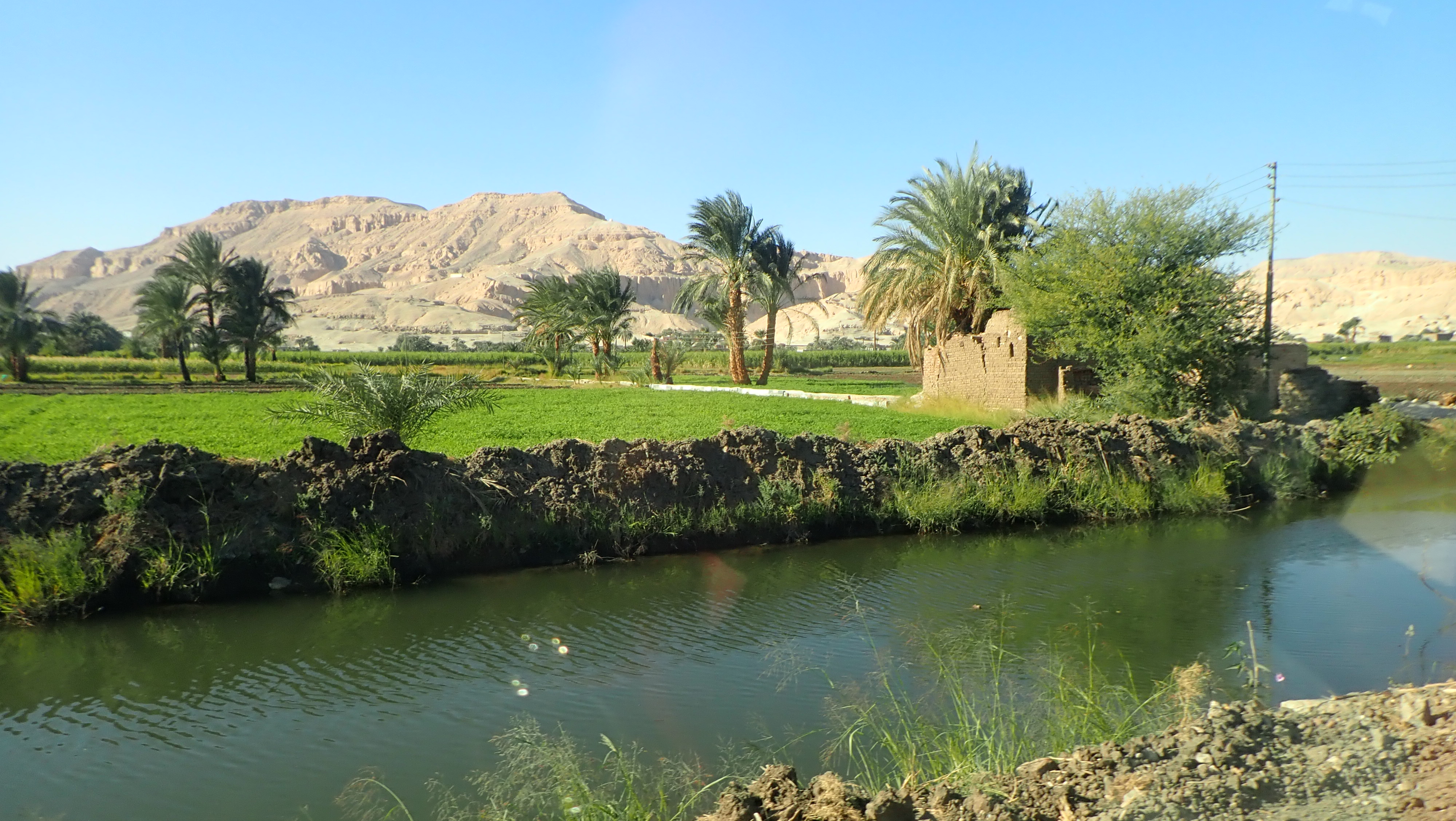 Luxorの西岸へ、市街を抜けて水路に沿って進むと、様々な畑がモザイク状に入り組んだ農地が広がっています。