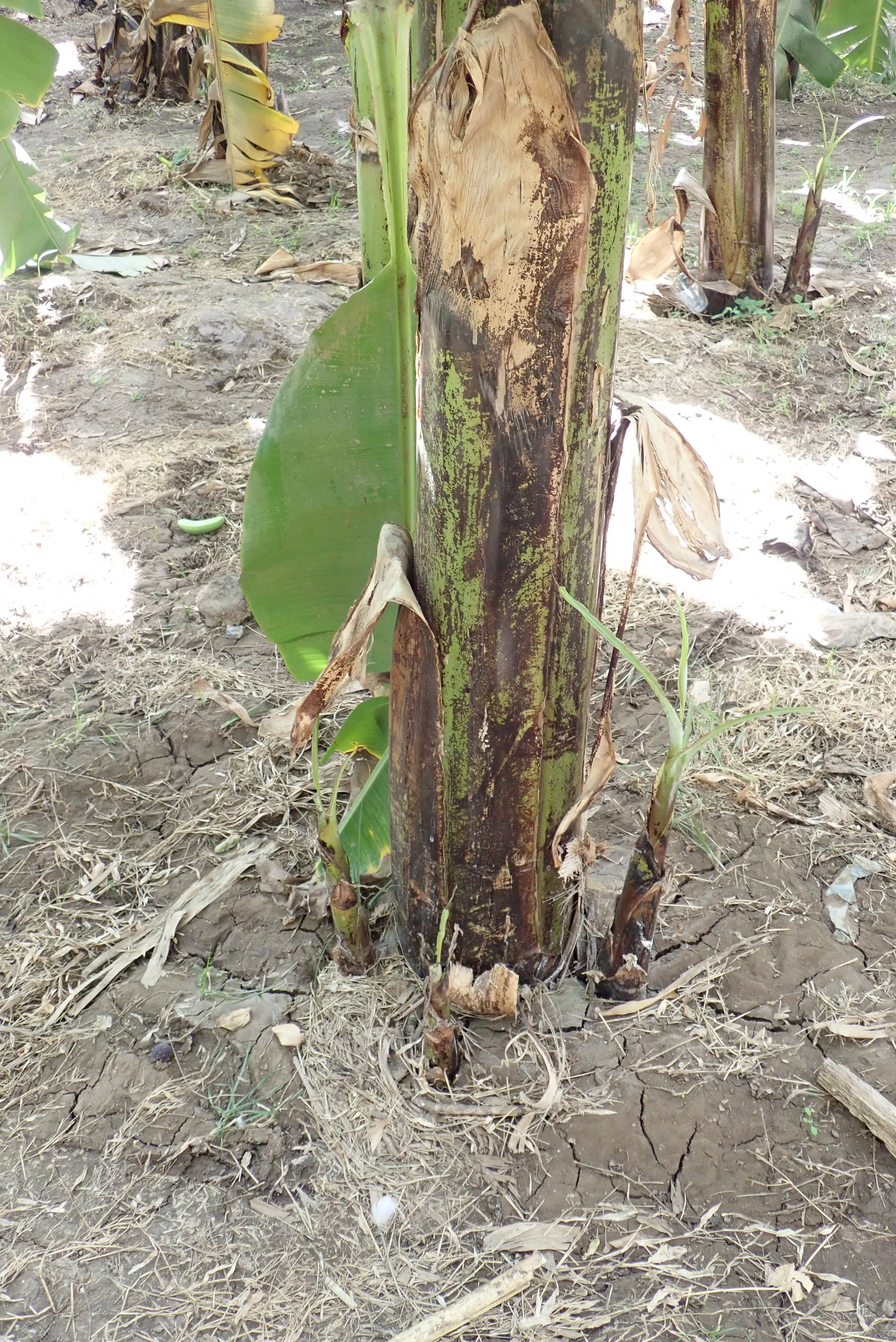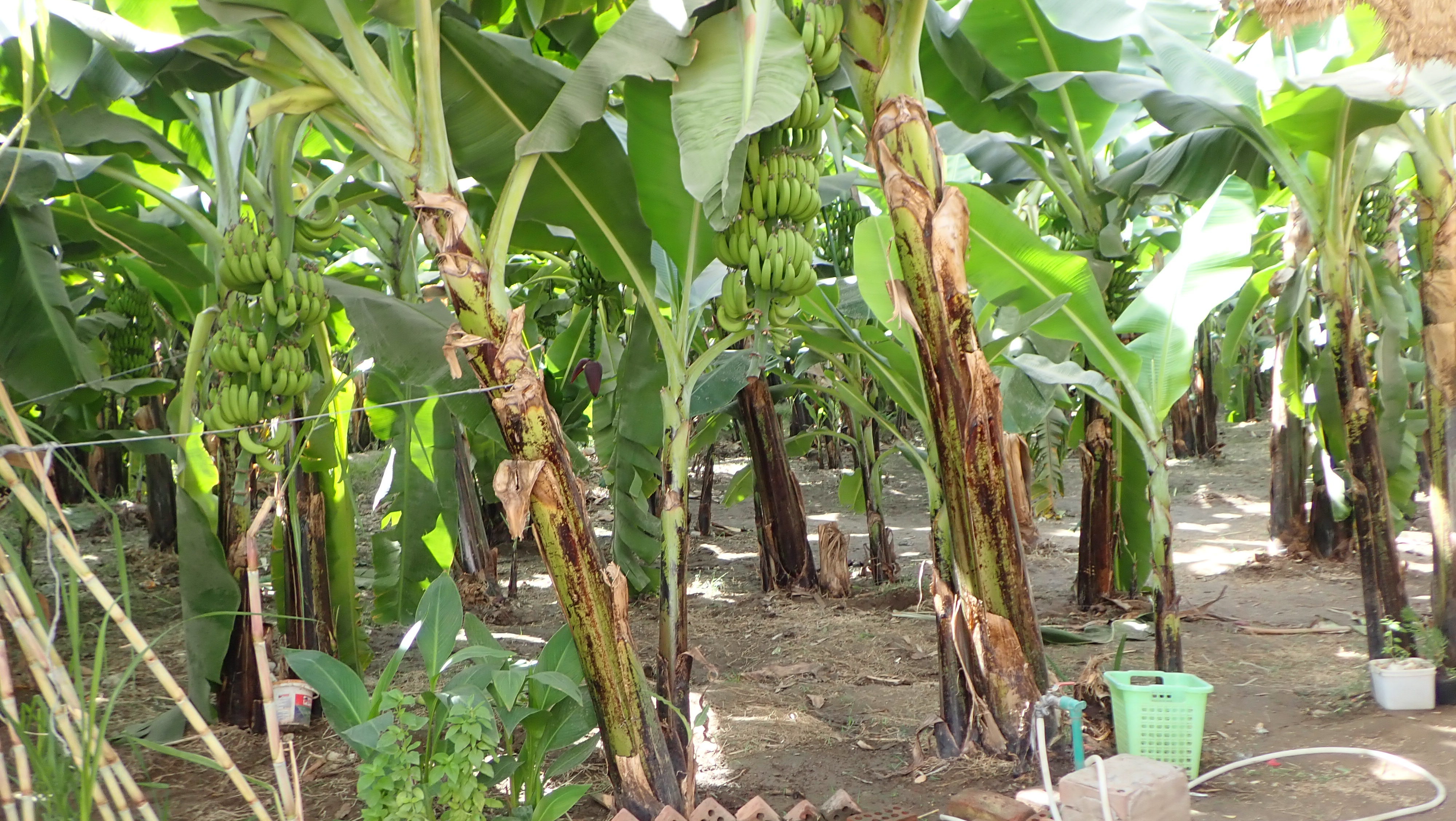 バナナの収穫は2-3月に行い、収穫後35日は一切の水を断ちます。病気に冒されていないかぎり完全伐採はせず、バナナの木の上側1/3だけを切り捨て、残りの栄養で周りに生えて来る新芽を育てます。