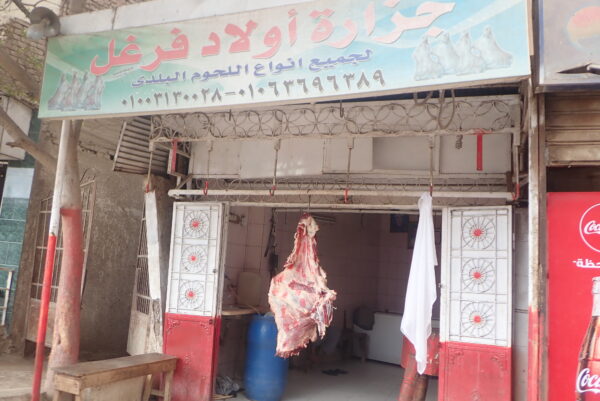 小さな肉屋では軒先に肉が常温で吊るしてあります。