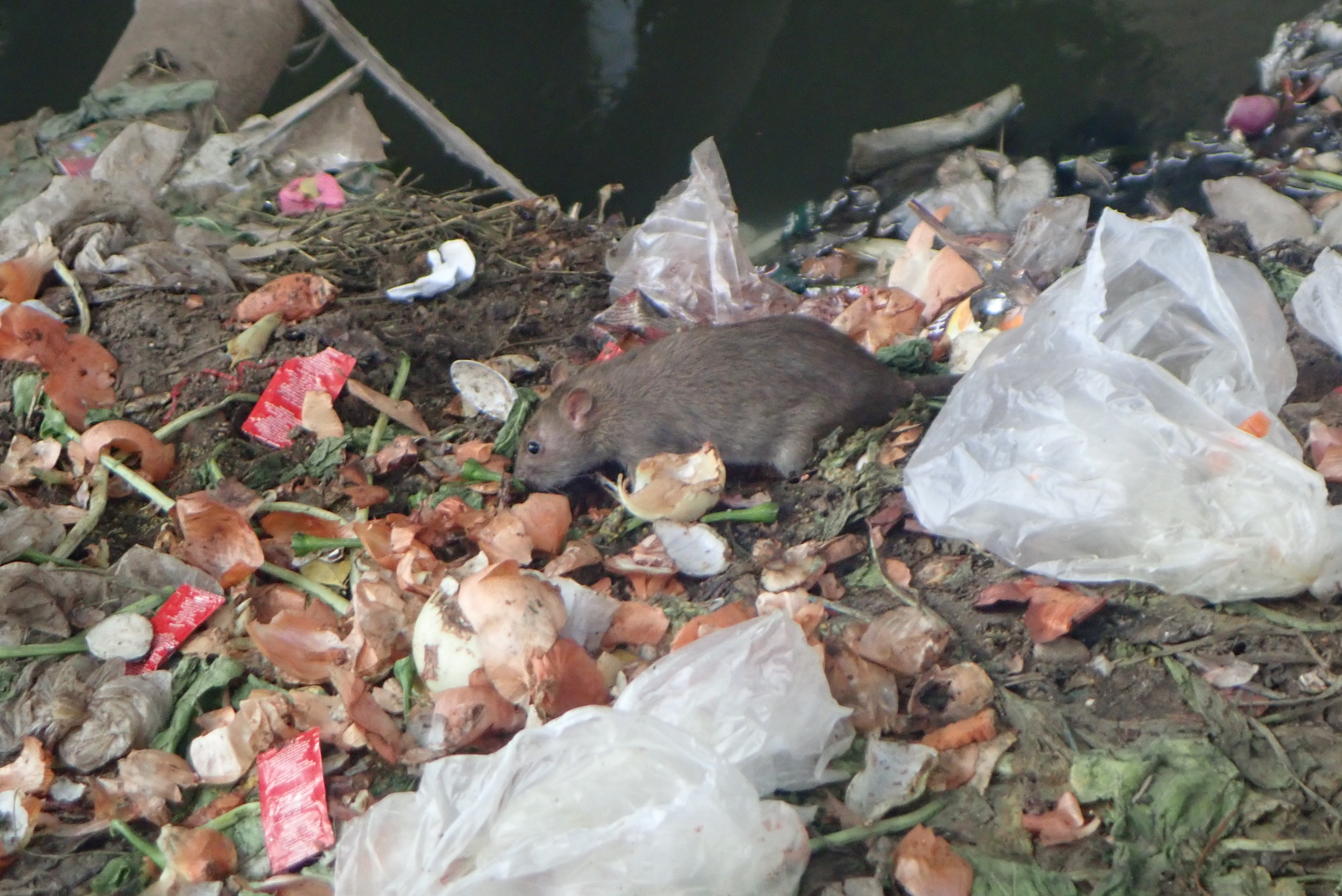 大きなクマネズミが生ゴミとプラスチックが散乱した中で餌を漁っていました。