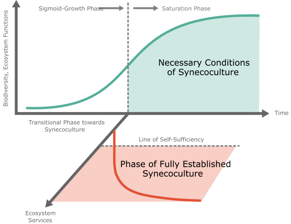 As one implements the Synecoculture and starts to build the ecosystem, the biodiversity within a farm improves over time. It approaches the target vegetation state in a manner similar to sigmoid-type growth.In the first half of the sigmoid, a healthy plant tissue provided by ecological optimum state that Synecoculture aims for may not be reached, but it does create self-supporting consumption in home garden-like environments.