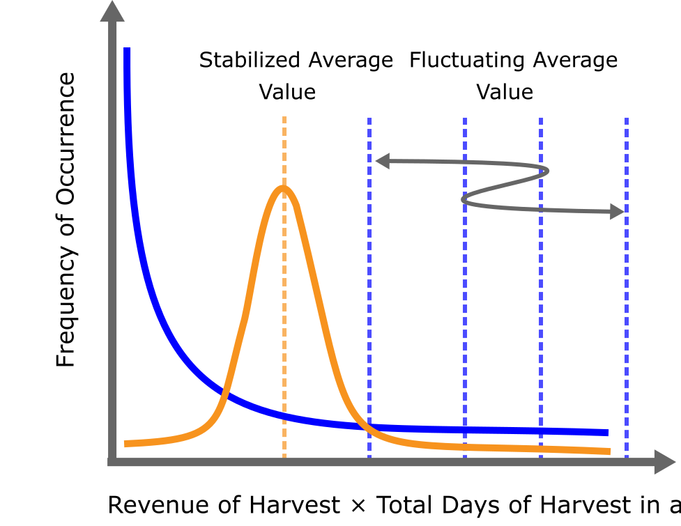 <Power Law Distribution Yield> Although the yield produced through conventional farming creates a bell-shaped “normal distribution,” the yield produced through Synecoculture is based on the so-called “power law distribution” to create vegetation in a natural state.The power law distribution appears widely in natural phenomena like, for example the scale and frequency of earthquakes. As earthquakes of lesser magnitude occur more frequently than do earthquakes of greater magnitude, in Synecoculture, small harvest of a variety of plants can be attained from many different environment, but large harvest from single species or environmental conditions is rarely observed. Since it fluctuates greatly in rare events, the average values of power law distribution should not be used as a predictive indicator. As Synecoculture production could greatly increase through rare large harvests, it will be necessary to update the yield description according to the evaluations of each step. In order to stabilize the fluctuating production that is the cause of power law distribution, the Synecoculture of various crops in the “portfolio” should be managed like an equity investment.