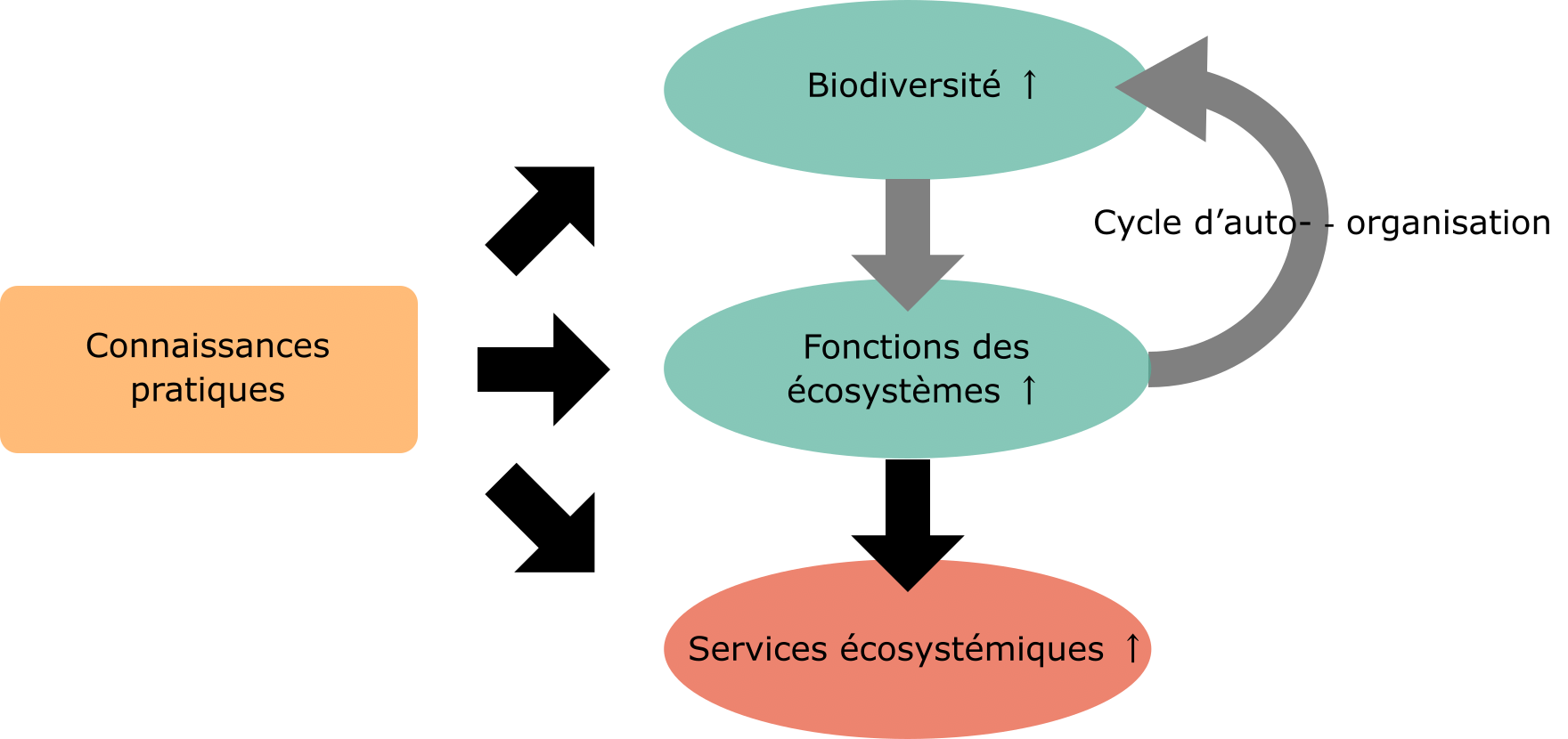 Lorsque la biodiversité devient plus riche, les diverses fonctions des écosystèmes s’améliorent. Les fonctions des écosystèmes régulent les conditions environnementales telles que la température, l’humidité, l’intensité d’ensoleillement, les substances organiques et les minéraux du sol pour les rendre plus faciles à vivre pour davantage d’êtres vivants. Les fonctions des écosystèmes devenant plus performant permettant à leur tour une biodiversité plus riche, les fonctions des écosystèmes et la biodiversité augmentent en synergie. Les fonctions des écosystèmes et la biodiversité augmentant, divers services écosystémiques nécessaires à la vie humaine tels que la production alimentaire peuvent être rendus.