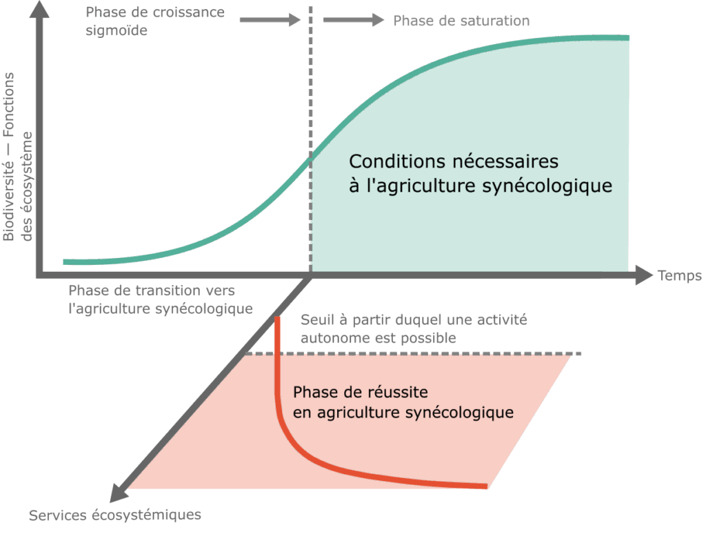 Grâce à la construction de l’écosystème parralèlement à la mise en pratique de l’agriculture synécologique, la biodiversité du champ augmente avec le temps et suit une croissance de forme sigmoïde en se rapprochant de l’étape de végétation planifiée. La phase de croissance depuis le début de l’ascension de la sigmoïde jusqu’à la première moitié correspond à la phase de transition vers l’agriculture synécologique. A cette phase, dans certains cas on n’arrive pas à un tissu végétal sain obtenu grâce à l’optimum écologique – qui est la critère des produits de l’agriculture synécologique – une consommation en autonomie à l’échelle d’un jardin familial par exemple est déjà possible.
