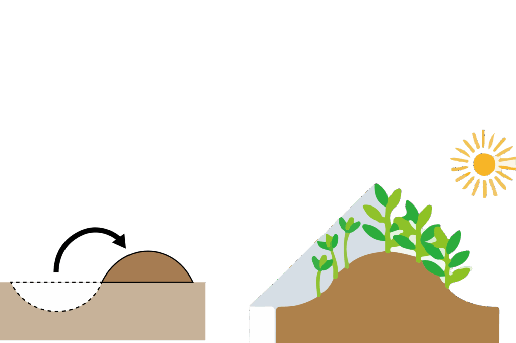 幅1~1.5m ほどの畝を最初に作る、土は耕さずただ畝の形に 盛るだけで良い。 長い根菜を作りたい場合は深くまで耕したほうが形は良くなるが、必要条件ではない。 畝の幅は両側から収穫できる最大の大きさとして設定されているので、管理者の体格に応じて適宜調整する。 収穫に高枝ばさみなどの道具を用いる場合は、管理しやすい幅に広げても良い。