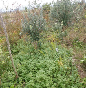 ミントの密生地帯にフェイジョア、タラノキ。放置しても有用植物で優勢するように管理コストを減らした例。