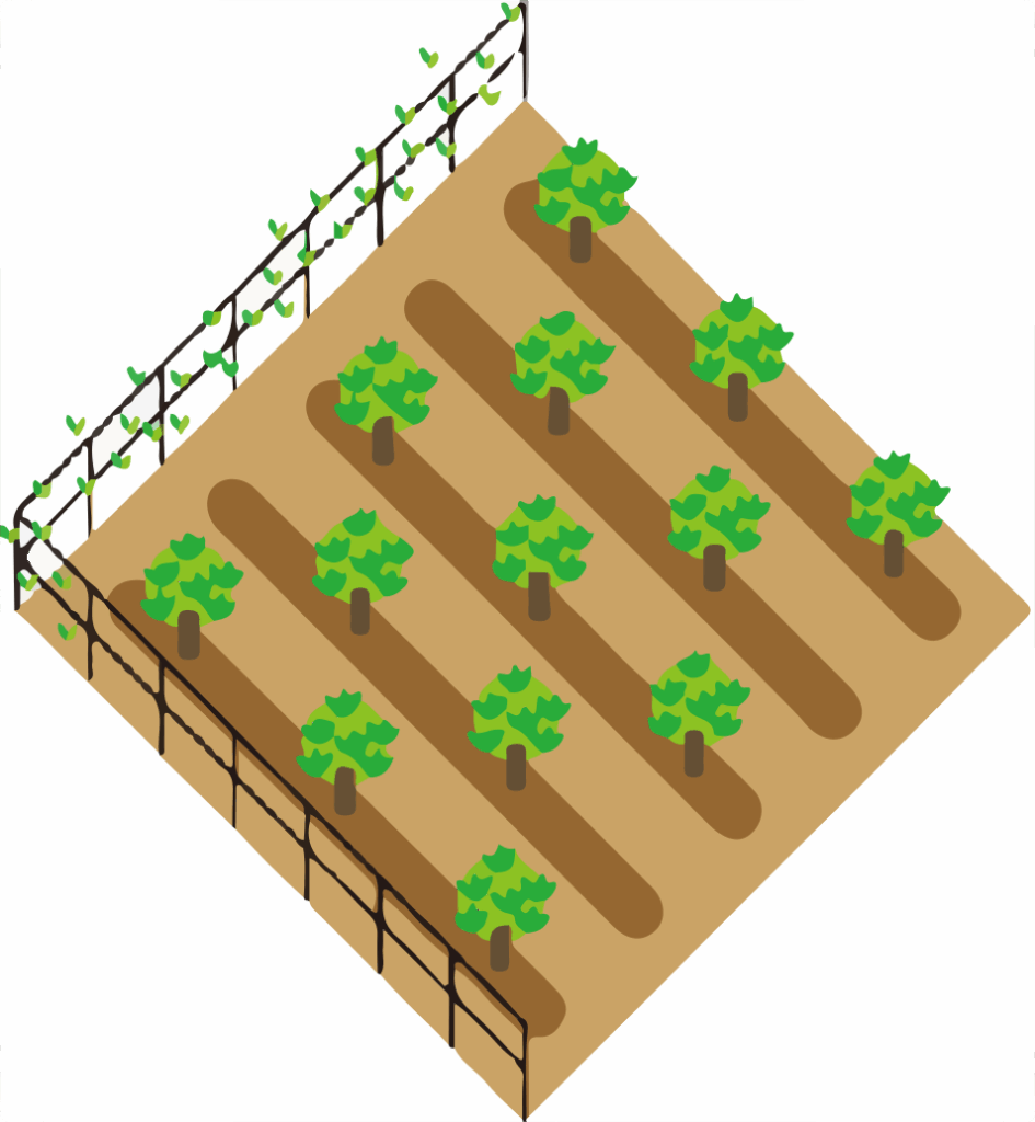 畝の中央部に、1.5m ほどの間隔で落葉性の低木果樹や小型のブッシュを形成する植物を植える。 果樹を植える目的は、優先度の高い順に以下の4 点である。