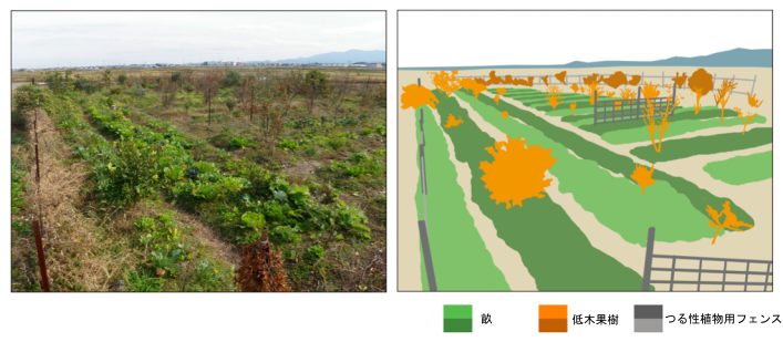 シネコカルチャー農園の一例の全景と模式図。(2010年11月、伊勢農園)