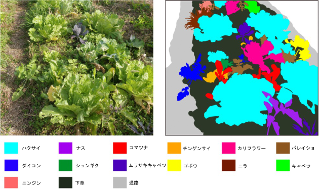 農園の生産面の一例。大きく成長した野菜だけでも4㎡に 13 種類が認められる。 (2010 年 11 月、旧伊勢農園)