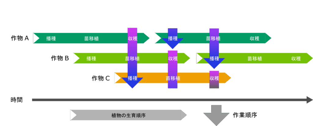 同様に、作物Bの収穫ー作物Cの苗を移植ー作物Aの追い蒔き、 作物Cの収穫ー作物Aの苗を移植ー作物Bの追い蒔き の作業セットも並行して示されている。