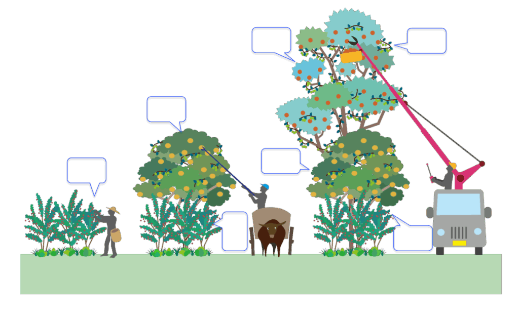 広大な耕作放棄地を効率的に管理したり、先進国における経済・技術水準や農業従事者の割合に適した生産性を上げるためには、シネコカルチャーの大規模化・機械化が有効であると予想される。 機械化は、シネコカルチャーの定義と原則の遵守に加えて、機械・技術を導入することでより複雑な生態系を効率的に管理できる場合のみ許容される。 例えば、シネコカルチャーの管理作業のうち、種苗の定植、草管理、収穫の部分が機械化の対象となり得る [Ohtani et al. 2022] [Aotake et al. 2025] 。 大規模化にあたっては、収穫や管理の効率化に適した 植生・配置・産物の種類・収穫法 などの組み合わせの創出が必要である。