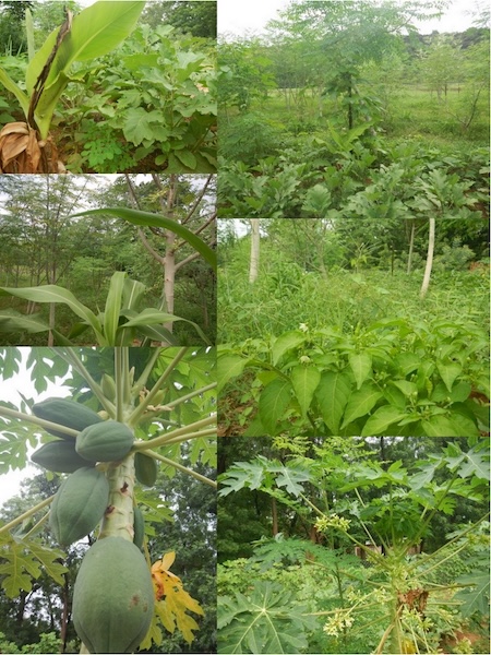 亜熱帯の南西諸島を例年通過する台風の強風対策には、 パパイヤやバナナなどの成長が早く折れやすい果樹を混生密生させた防風果樹林という戦略がある。 植栽密度を高めることで生産性は落ちるが、互いに支えあって防風効果は高まるため、風表に苗床として配置できる。 逆に、防風果樹林に囲まれた風裏では、マンゴー、シマバナナ などの果樹、グアバ、シマサルナシ、キウイ などのつる性植物を混生して、ある程度生産性を優先した間合いで生育する。
